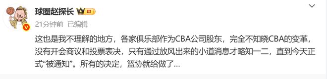 根据赵探长转发的内容,他表示:各家俱乐部作为CBA公司股东,完全不知晓CBA的变革,没有开会商议和投票表决,直到今天正式“被通知”。所有的决定,篮协就给做了…。这样的动态就非常明确了,这次潜力赛的比赛,只是CBA这边自己认为,并没有开会确定。我相信各个球队在看到这样的决定之后都懵了。而现在距离下赛季不到一个月的时间了,这么匆匆忙忙和突然的做出决定,他们肯定都来不及反应。再加上自媒体和球迷也都有点懵,大部分人都在发表了不好的话语。