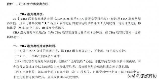 媒体人付政浩发文点评:“CBA 潜力赛采用 2×5 分钟的比赛方式,即 CBA 潜力赛分为上、下半场,每半场 5 分钟。若比赛在常规时间内战平,则进行“金球致胜”办法,即比赛两支球队重新中圈跳球,率先获得 2 分或 2 分以上的球队为本场比赛胜者;常规时间与金球致胜期之间无休息期。原则上,参加CBA潜力赛的都是各队的非首发球员,但在特殊情况下也可以安排首发球员出场,如某球队符合 CBA 潜力赛参赛资格的球员在 CBA 联赛当场比赛中受伤下场、且后续再无上场时间记录的;或因 TUD 犯规被取消该场 CBA 联赛当场比赛资格(不包括因个人犯规累计满5 次的球员),导致该场 CBA 潜力赛参赛人员不满 5 名时,则可补充该队 CBA 联赛当场比赛国内首发球员,受伤(或罚出)1 人可补充 1 人参赛,以此类推,直至 CBA 潜力赛报名参赛人员达到 5 名,同时,对手球队有权更改同等(或少于)数量的国内首发球员参赛。另外,CBA潜力赛还推出额外参赛球员规则:各球队可最多增加 2 名 CBA 联赛非当场比赛报名的国内球员参加CBA 潜力赛,但该规则只有在客队选择使用额外参赛球员时才适用于主队,主队不得单独使用额外球员。双方球队必须在本场 CBA 联赛比赛中场休息结束前 4 分钟内,向记录台提交本场 CBA潜力赛的球员名单,参赛球员不超过 9 名球员、不少于 5 名球员;当某球队出现须由国内首发球员补充参赛的情况,则须在 CBA 联赛该场比赛结束后1分钟内向记录台提交更换申请,并通知参赛对手确认是否进行人员更换;如某球队因伤病等原因,赛前比赛球员人数不足 5 人则视为弃权。”对于这个赛后的方案,实际上争议比较大的地方是赛后的8分钟进行,仿佛是强行填补了从48分钟改成40分钟的规则。