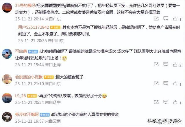 有球迷点评表示:“把发展联盟按照g联赛搞不就行了,把年轻队员下发,允许签几名网红球员(要有一定实力),还能提高热度。二轮秀或者落选秀给双向合同,这样不会有大量弃权现象”。比赛时间缩短了 最简单的就是增加相应场次 场次多了 球队看到大比分落后也愿意让年轻球员垃圾时间上场。青年联赛要有自己的主客场,媒体直播,而不是像以前U系列那样集中比赛,纯属走形式。