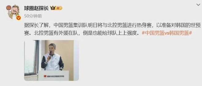 Nice,又有国家队比赛可以看了。国内知名媒体人报道,中国男篮将与北控队进行热身赛,以此备战11月28日(主场)-12月1日(客场)两战韩国男篮的世预赛。中国男篮于11月14日在国家体育总局训练局开始集训,11月27日结束。至于提到的北控队外援,如下:里勒,后卫,上赛季在CBA效力北控队,常规赛场均20.3分3.6板4.2助1.6断;西伯恩,锋卫摇摆人,曾在NBA发展联盟效力鹈鹕下属球队伯明翰中队,场均砍下17.9分;佩里,内线,上赛季在CBA效力深圳队,常规赛场均25.3分8.5板3.1助1.3帽。中国男篮本期集训总共19人入选,具体如下:后卫赵睿、廖三宁、王岚嵚、程帅澎、高诗岩、胡明轩;前锋曾凡博、雷蒙、张宁、张镇麟、刘礼嘉、朱俊龙、赵嘉义;内线周琦、蒋浩然、胡金秋、焦泊乔、李祥波、余嘉豪。韩国男篮当家球星李贤重接受采访谈及接下来与中国男篮的世预赛大战,表示肯定想要两战全部取胜。今年亚洲杯八强赛,中国男篮79-71击败韩国男篮,此役李贤重出手15次中6球,其中三分11中2,罚球9中8空砍22分外加7板4助,赛后痛哭流涕。尽管今年世预赛,中国男篮少了在今年亚洲杯场均13分4.2板入选最佳阵容的王俊杰,可随着周琦&曾凡博&张镇麟等人回归,阵容深度得到进一步提升,所以我们在整体实力上依然胜过韩国男篮,有很大概率让对手两战全胜的美梦破灭。总之,相信郭士强的保下限能力,他执教的中国男篮丝毫不怵任何亚洲球队,当然未来还是希望能够与世界强队照样可以碰一碰,在此之前得先顺利拿到27年世界杯的参赛名额。