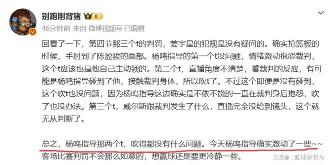 辽宁队与北京队,他们都是CBA的传统强队,这两支的实力都非常不错。新赛季开赛至今,他们都获得2胜0负的战绩,谁能够拿下这一场比赛,谁就能坐上CBA榜首的位置。首节比赛开始后,两队的状态还是非常不错的,北京队单节砍下24分,辽宁队也不甘示弱,单节也有22分进账。而在进入到第二节比赛以后,两队继续紧咬比分,辽宁队单节拿到20分,而北京队这边单节也有19分进账。上半场结束时,北京队手握1分领先优势。易边再战,辽宁队在第三节比赛展开全面反击,在威尔斯的带领下,辽宁队接连反击上篮得手,辽宁队逐渐占据上风。整个第三节比赛,他们单节拿下21分,而北京队这边也有19分进账。不过,前三节比赛结束时,辽宁队已经反超领先北京队1分。在过去两场比赛,辽宁队都顶住压力,先后击败了天津队和广厦队。如果这一场比赛,辽宁队能够在第四节继续稳住,他们还真有望客场掀翻北京队。不过,在第四节还剩下6分多钟时,姜宇星与陈盈俊的一次拼抢中,姜宇星的手打到了陈盈俊,随后裁判响哨,吹罚了姜宇星犯规。这本该是一次正常不过的犯规。不过,当时站在场边的杨鸣却认为,陈盈俊这球有假摔嫌疑,姜宇星的动作并不大。随即,杨鸣直接上前找裁判理论,现场火力全开,嘴里喋喋不休的怒喷裁判。而对于见惯大场面的裁判,他们也似乎不给面子,直接吹了杨鸣一个T。事情到这里,其实就可以结束了。可杨鸣对于这个吹罚,还是极为不满,又是对着裁判一顿输出,这下裁判被彻底惹急了,直接又追加杨鸣一个T,当场将他当场驱逐出去。而在杨鸣被驱逐出去后,辽宁外援威尔斯又针对裁判进行了抱怨,疑似有爆粗口嫌疑。对此,裁判又再度出手,给了威尔斯一个T。这样一来,辽宁队在这一个回合中,便连吃3T,并且送给对手6次罚球机会。原本辽宁队只是落后北京队6分,这个回合罚球后,辽宁队已经落后12分,大势已去。毫无疑问,杨鸣这一次不冷静的暴怒,成为了本场比赛的一大转折点,如果在领到第一个T后,杨鸣能够冷静一下,便不会有接下来的一系列吹罚,双方现在鹿死谁手还真不好说。所以说,辽宁队这一次输球,杨鸣应该为自己的不冷静买单。当然,这一场比赛还有一大争议点,那就是辽宁队连吃3T后,算上姜宇星的犯规,他们大概就是罚球5次,可裁判最终却给了他们6次罚球的机会。