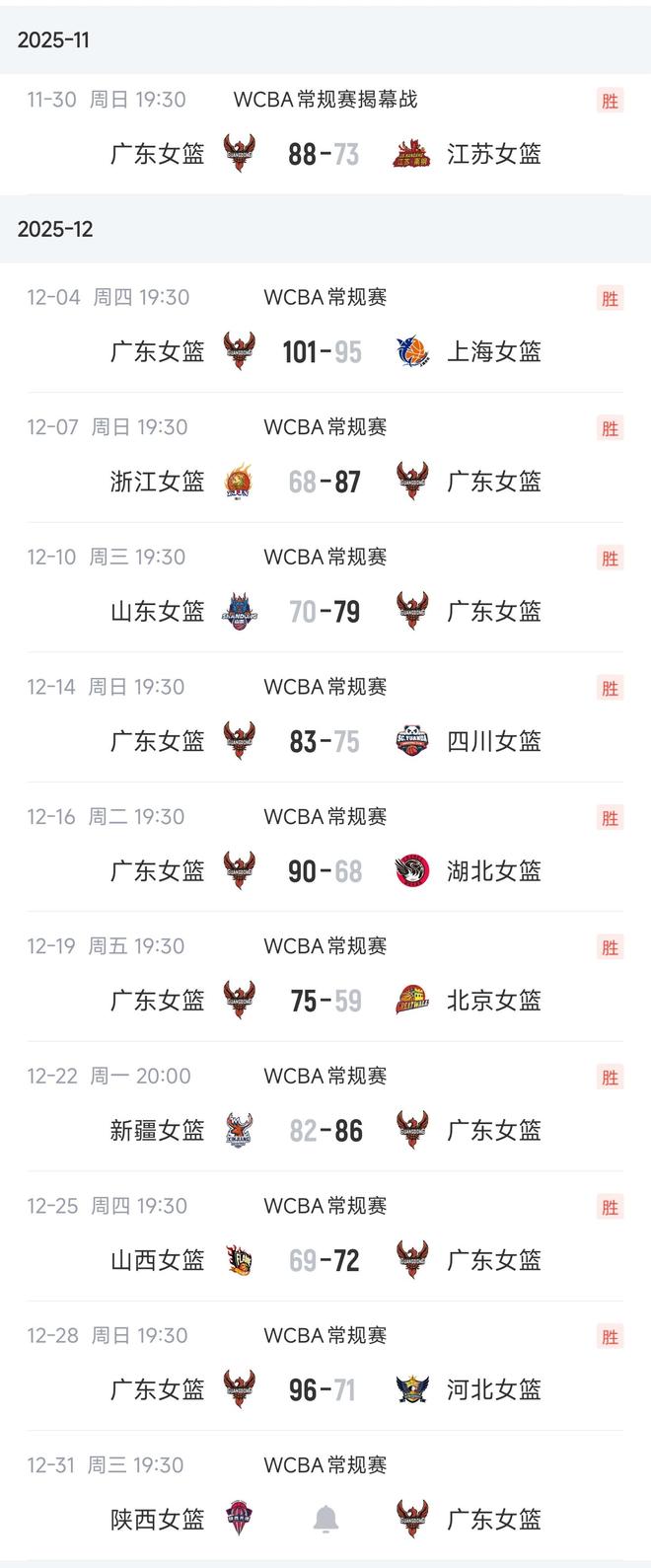 北京时间2025年12月29日消息。刚刚结束的一场WCBA女篮联赛常规赛,广东东莞女篮96-71,大比分战胜河北女篮。这样,本赛季开始后的10轮联赛,东莞队也是豪取一波十连胜。12月31日,广东女篮将客场迎战陕西,球队有望以一波十一连胜结束非常辉煌的2025自然年。——对于目前的这支广东女篮来说,实现了新老交替的流畅进步,可喜可贺。我们看到了一个进步飞快的杨舒予!从东京奥运周期开始,中国女篮迎来一波黄金一代,球员代表包括中锋的韩旭、李月汝。前锋的黄思静、李梦,后卫的王思雨、杨力维等。从东京到巴黎,这两届奥运周期的时间段内,国家队战绩优秀,同步的,国内女篮联赛的竞争也是非常激烈。主要的争霸双雄是四川和内蒙古,而广东东莞则是相对排名第三的位置。2021到2024,这四届WCBA女篮联赛,内蒙古和四川女篮分别各获得两次女篮联赛冠军后,来到2024-2025赛季,球迷也是普遍公认四川队实力最强,内蒙古稍逊,东莞第三。从常规赛的走势来看也是如此,四川仅仅输了一场。但是来到淘汰赛,韧劲十足的广东女篮迸发出了澎湃动力。而四川女篮由于主力球员均有较严重的伤病,发挥受限,最终的总决赛,东莞女篮夺冠。东莞的老将组合,1998年以前出生的迪拉娜、杨力维、黄思静发挥十分出色,而杨舒予更是打出了FMVP的表现。这之后,国家队集结并且拿到女篮亚洲杯的季军。再经过一段时间的休息和调整后:广东女篮又连拿两个冠军,分别是亚俱杯冠军,以及全运会冠军。——这样,2025年,广东女篮实现了三冠王。在连续夺冠的同时,东莞女篮的新老交替在同步进行:于东退役,黄思静尽管还是球员兼教练,但是教练的比重增加,杨力维也在进行休息和调整。广东女篮在新赛季开始后,以杨舒予、迪拉娜为球队的主干力量,连战连捷!主要竞争对手里面,四川女篮中,李梦、韩旭出国,王思雨一直养伤,实力下滑。内蒙古女篮退出。如今来看,新赛季的WCBA呈现出来了新的局面:广东保持强势态势,十连胜一路领先。紧随其后的是山东、山西和江苏。这是最新的WCBA联赛积分榜: