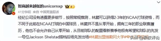 媒体人王健发文点评:经纪公司没有透露更多细节,按照常规推测,林葳可以获得2-3年的NCAA打球资格,而不同于此前在NCAA打球的中国球员,林葳并不是从零开始,拥有三年的职业联赛履历,他也不会允许自己从零开始,从目前球队的配置看新赛季他极有希望和球队的先发一号位Jackson Shelstad搭档后场先发出场媒体人海jun的蓝发文说道:“林葳的经纪公司终于官宣了,这样的话应该就不会耽误新赛季的赛程了,其实对比过往其他国家的职业球员加盟NCAA这个速度算是挺快了,很期待林葳下赛季的NCAA表现,希望俄勒冈大学能成为他冲击NBA的跳板。