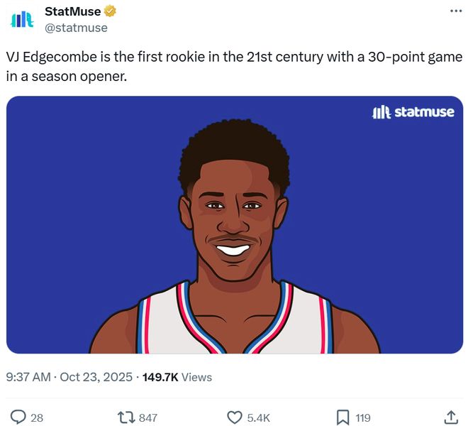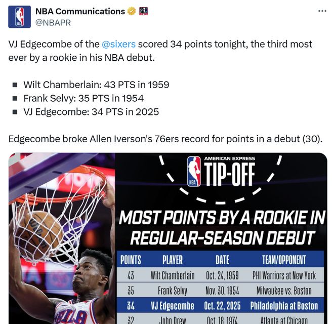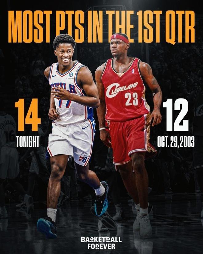 全场砍下34分,不仅让其超越艾弗森创造76人队史首秀得分新纪录,也成为新世纪以来首位能够在揭幕战就轰下30+得分的新秀。