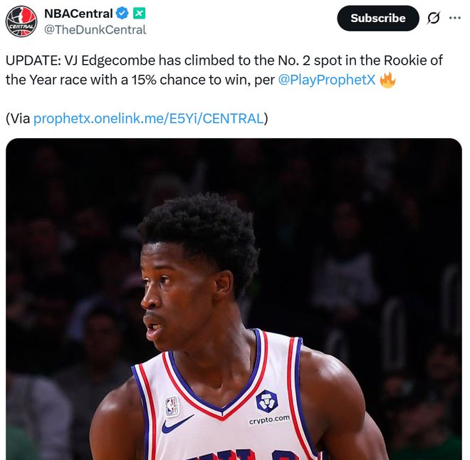 埃奇库姆的横空出世,让原本“美国之子”弗拉格一家独大的25年最佳新秀竞争再起波澜。本场比赛结束后,美媒ProphetX迅速更新年度最佳新秀概率,其中埃奇库姆飙升至15%。更重要的是,埃奇库姆的出现也让原本一潭死水的76人队看到了重返竞争者行列的希望。