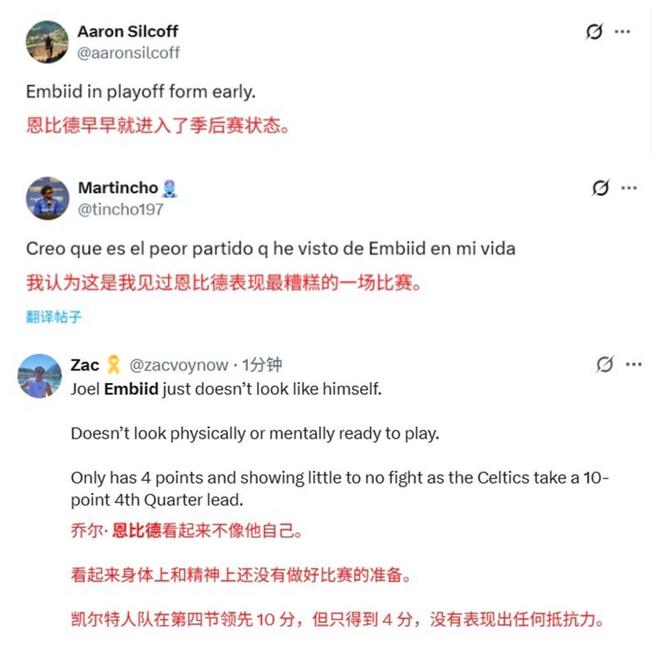 面对恩比德如此糟糕的表现,美国球迷也是毫不留情对其点名批评,直言恩比德已经不再是自己,也有球迷调侃恩比德早早进入季后赛状态。