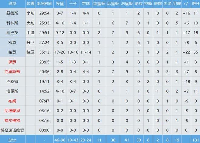 流弊,登哥太流弊了,必须吹到他生活不能自理,梦回巅峰。天啊,都36岁的人了,哈登投篮26中17,其中三分球16中10,罚球14中11狂轰55分外加3板7助,带领快船131-116击败黄蜂。快船数据如下:黄蜂数据如下:等等,哈登和保罗合砍58分.手动狗头。讲讲保罗,他会在本赛季结束之后退役,自己为期长达21个赛季的NBA生涯即将落下帷幕,其今年已经40岁无法做出实质性贡献,曾连续5场比赛被泰伦卢DNP。言归正传,单场55分,哈登创造了快船队史单场得分纪录。值得一提的是,哈登同样保持着火箭(61分)的队史单场得分纪录。就此,哈登成为NBA史上首位保持着两支不同球队队史单场得分纪录的球员。据统计,本赛季至今,哈登场均贡献28.4分6板8.5助1断,投篮命中率46.1%,三分命中率40.8%,场均得分为近六个赛季的新高,也是他自离开火箭之后的场均最高分。就是非常可惜,无论哈登多么神勇,都可能改变不了本赛季快船溃败的局面,球队目前仅仅取得5胜11负战绩排名西部第12,距离第十的爵士0.5个胜场,如此糟糕的情况搁开赛前根本不敢想象。好在据名记Haynes报道,伦纳德将在北京时间下周一快船客场挑战骑士比赛中复出,这哥们因脚部伤势已连续休战10场,本赛季至今才打了六场比赛,场均砍下24.3分5.7板3.5助2.5断,三项命中率50.5%、40%和96.3%,他和哈登的联手有望帮助球队至少锁定附加赛名额。明夏哈登拥有球员选项可以拒绝执行提前进入自由市场,如果可以的话到时最好投奔一支年轻有为的争冠球队,别白白浪费自己剩余不多的巅峰期,有时候选择远比努力重要。