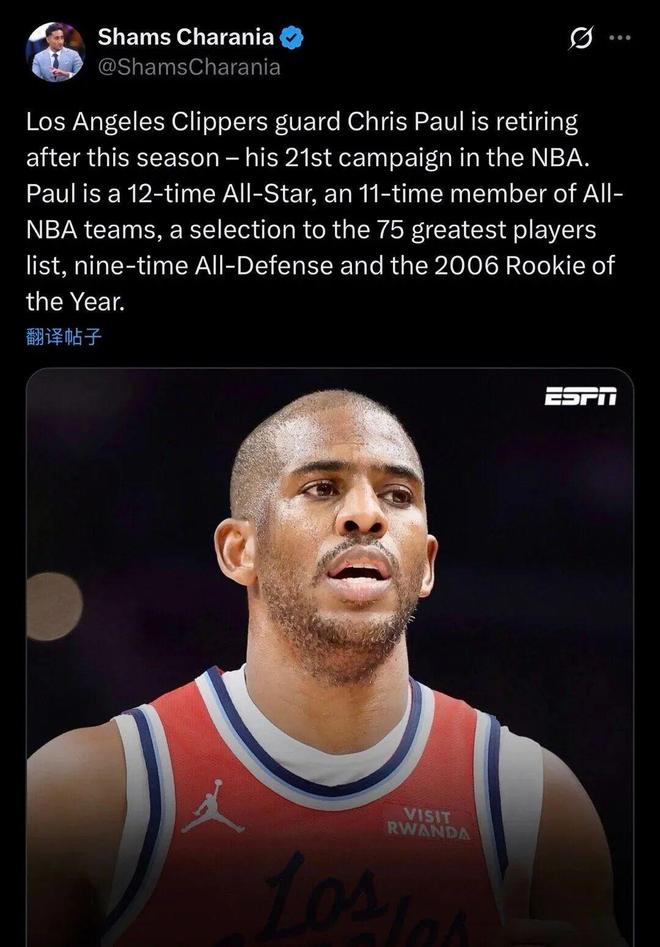 爆料王Shams对此表示,保罗将在本赛季结束后宣布退役。据票务网站信息,保罗常规赛生涯谢幕战,即明年4月13日快船主场VS勇士的比赛,最低票价已涨至129美元。