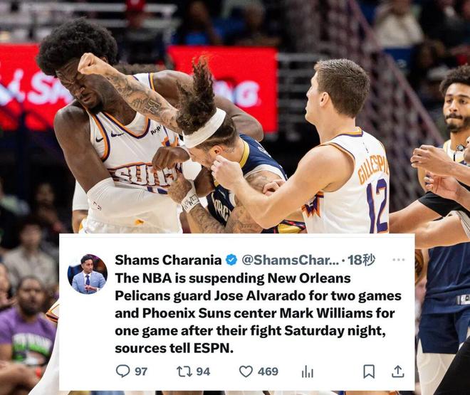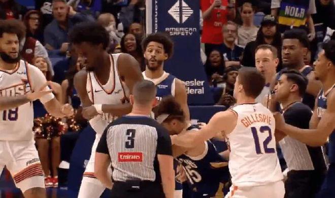 肖华:年末了给我搞事情?重罚,必须重罚。NBA官方宣布:鹈鹕的阿尔瓦拉多被禁赛两场(损失约6.2万美元),马威则被禁赛一场(损失约3.6万美元)。最近结束的太阳123-114鹈鹕比赛,第三节阿尔瓦拉多和马威发生激烈冲突,两人挥拳相向,硬生生将篮球场变成UFC赛场。1米83的阿尔瓦拉多对战2米16的马威丝毫不怂,抓住机会给了这个大个子一个摆拳,要是打准了当场KO都有可能。身后观战的普尔,表情像极了吃瓜群众,或许都让他想起昔日往事。什么往事呢?请看VCR。22年勇士队内训练,追梦格林给了普尔一记重拳,直接将后者打倒在地。言归正传,好久没有看到过NBA发生如此拳脚相加的冲突,大多数时候都是互相推搡喷点垃圾话就完事了,只不过两个当事人的钱包因此得疯狂吃瘪,只能说在这个联盟打架需付出的代价花费太大,非顶薪球员难以承受。阿尔瓦拉多本赛季薪资才450万美元,马威好点也只有633万美元......目前为止,鹈鹕以8胜25负继续西部垫底,有着14%状元签概率,然而明年无保护首轮签在老鹰手里;太阳以18胜13负位列西部第七,落后第六的森林狼1.5个胜场。太阳本赛季的表现让人惊讶,在失去杜兰特和比尔之后,非但没有掉入鱼腩行列,还有望打进季后赛,而他们上赛季拥有豪华阵容却被季后赛拒之门外。今夏休赛期与杜兰特互换东家,被火箭送至太阳的狄龙,“因祸得福”打出了生涯最佳一季,至今场均贡献21.4分3.1板1.7助1.3断,三项命中率45.9%、33.3%和81.3%,已经成为布克最好的帮手。彦祖们对此有何看法呢?评论区抄起键盘大胆开麦疯狂对线,双击屏幕即可直接点赞哟!