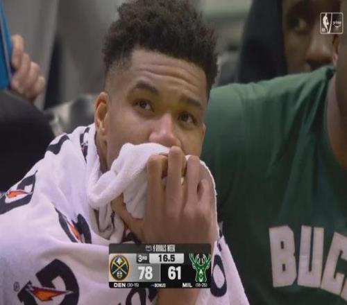 第四节还剩30多秒,雄鹿落后5分,字母哥准备下快攻时无对抗受伤。他用手捂着小腿,表情痛苦地走下场。字母哥随即退出比赛,他在板凳席上一言不发,充满着沮丧和绝望。字母哥的二哥萨纳西斯试图安慰他,依然没什么效果。