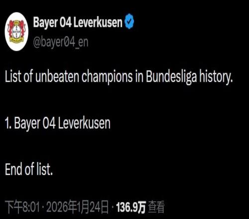 作为德甲历史上唯一一支不败夺冠的球队,勒沃库森官方在拜仁比赛结束后,更新社交媒体写道:“德甲历史上的不败冠军名单:1. 勒沃库森。名单结束。”