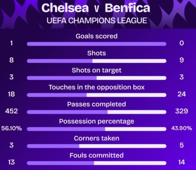 切尔西首发:罗伯特·桑切斯/古斯托(81'里斯·詹姆斯),特雷沃·查洛巴,巴迪亚希勒(81'阿昌庞),库库雷利亚/莫伊塞斯·凯塞多,恩佐·费尔南德斯,博纳诺特(54'埃斯特旺)/佩德罗·内托,泰里克·乔治(61'若昂·佩德罗),加纳乔(61'吉滕斯)【数说】24-本场比赛切尔西首发阵容的平均年龄是24岁整,是队史最年轻的欧冠首发阵容。8-莫伊塞斯·凯塞多在本场比赛中完成8次抢断,是2016-17赛季以来单场比赛中抢断次数最多的切尔西球员。1-穆里尼奥执教本菲卡在斯坦福桥输掉了一场欧冠联赛阶段的比赛,追平了他执教切尔西时在斯坦福桥输掉的欧冠小组赛数量。
