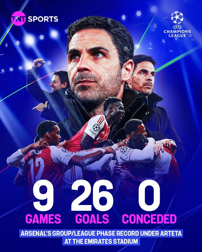 阿尔特塔时代,阿森纳欧冠联赛小组赛阶段主场全胜且0丢球