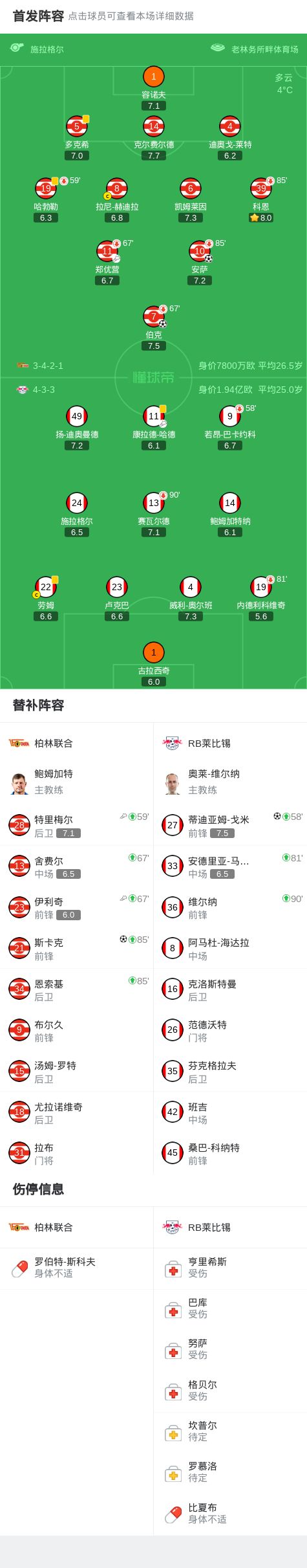 北京时间12月13日德国足球顶级联赛 联赛 第14轮,柏林联合主场对阵RB莱比锡。柏林联合伯克破门,安萨破门,斯卡克破门。RB莱比锡蒂迪亚姆-戈米破门。最终比分柏林联合 3-1 RB莱比锡。精彩瞬间第57分钟,柏林联合球员郑优营助攻伯克打入一球。第60分钟,RB莱比锡球员康拉德-哈德助攻蒂迪亚姆-戈米打入一球。第63分钟,柏林联合球员特里梅尔助攻安萨打入一球。下半场补时第3分钟,柏林联合球员伊利奇助攻斯卡克打入一球。球队阵容