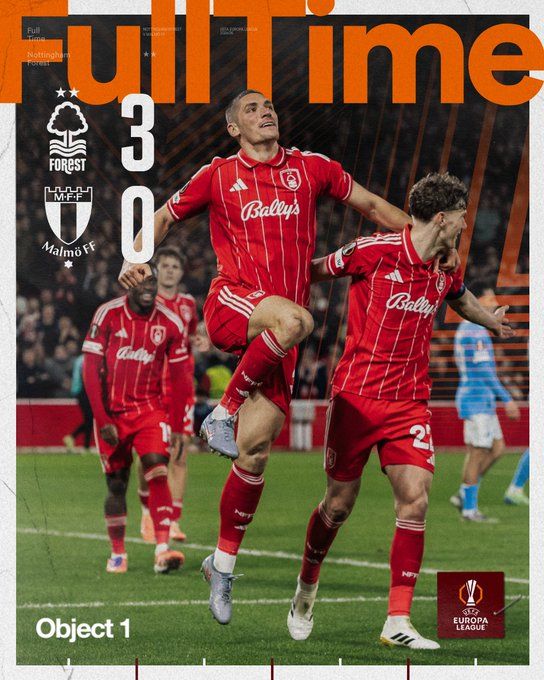 北京时间11月28日04:00,欧联杯联赛阶段第5轮,诺丁汉森林主场迎战马尔默。上半场,耶茨率先为球队打破僵局。随后卡利穆恩多接队友配合后攻入一球。半场结束,诺丁汉森林2-0马尔默。下半场,米伦科维奇为球队锁定胜局。全场比赛结束,最终比分为诺丁汉森林3-0马尔默。欧联 皇家贝蒂斯 2-1 乌德勒支
