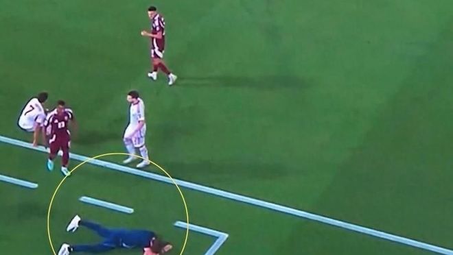 比赛进行到下半场,卡塔尔队主教练洛佩特吉正在场边指挥。突然,他被一记近距离的大力射门直接击中面部,当场倒地,失去意识,一动不动地躺在场边。这一幕让现场气氛瞬间紧张起来,球员和工作人员都露出担忧神色。