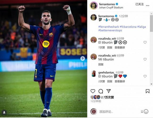 9月22日讯 西甲第5轮比赛,费兰-托雷斯梅开二度,帮助巴萨主场3-0击败赫塔费。费兰-托雷斯赛后在社交媒体上晒出照片,庆祝取胜+打进2球,配文:“+=⚽️⚽️”