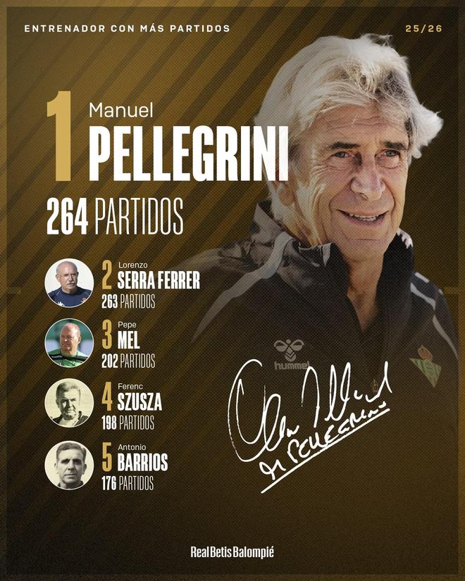 根据统计,本场比赛是现年72岁的佩莱格里尼自2020年夏天接手贝蒂斯以来率队出战的第264场正式比赛,他也就此超越了洛伦索-塞拉(263场),独占贝蒂斯队史主教练执教场次的第一位。在执教贝蒂斯的前263场比赛中,佩莱格里尼率队取得了123胜68平72负的成绩,并且赢得过21-22赛季国王杯的冠军。