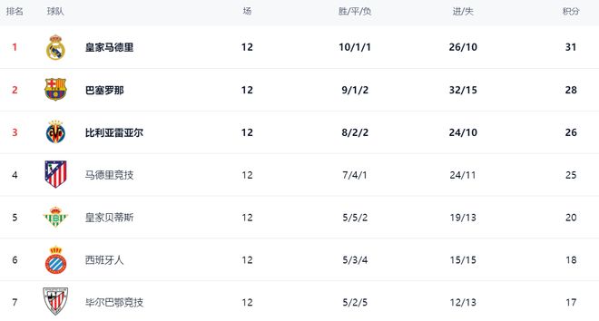 在积分榜上,皇马战绩是10胜1平1负,拿到31分,依然占据榜首位置。巴萨总积分是28分,缩小了与皇马的差距,排名第2。第3的是比利亚雷亚尔,拿到26分。马竞以25分排名第4。皇家贝蒂斯这轮只拿到平局,总积分20分,排名第5。西班牙人以18分排名第6。