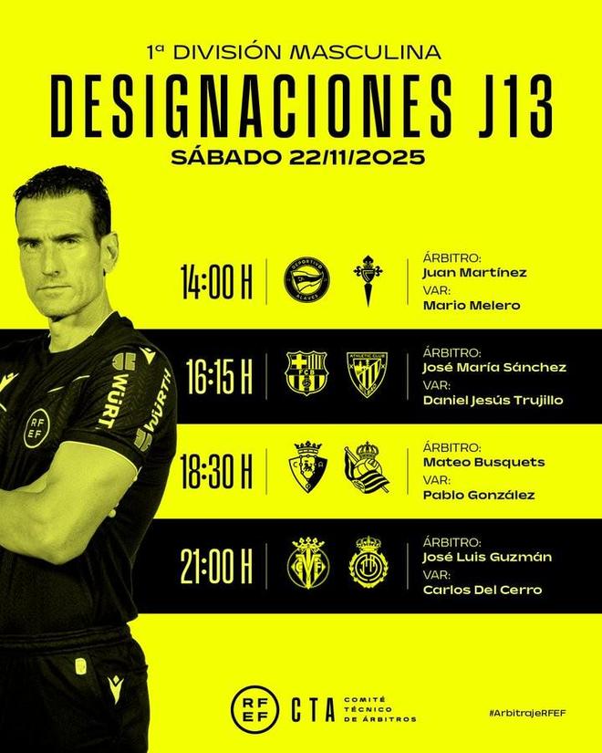 阿拉维斯vs塞尔塔主裁判:胡安-马丁内斯VAR:马里奥-梅莱罗巴萨vs毕尔巴鄂竞技主裁判:何塞-马利亚-桑切斯VAR:丹尼尔-赫苏斯-特鲁希略奥萨苏纳vs皇家社会主裁判:马特奥-布斯克茨VAR:巴勃罗-冈萨雷斯比利亚雷亚尔vs马略卡主裁判:何塞-路易斯-古斯曼VAR:卡洛斯-德尔塞罗