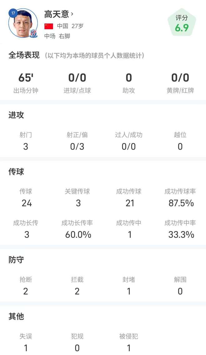 高天意全场数据:3次送出关键传球,传球成功率87.5%