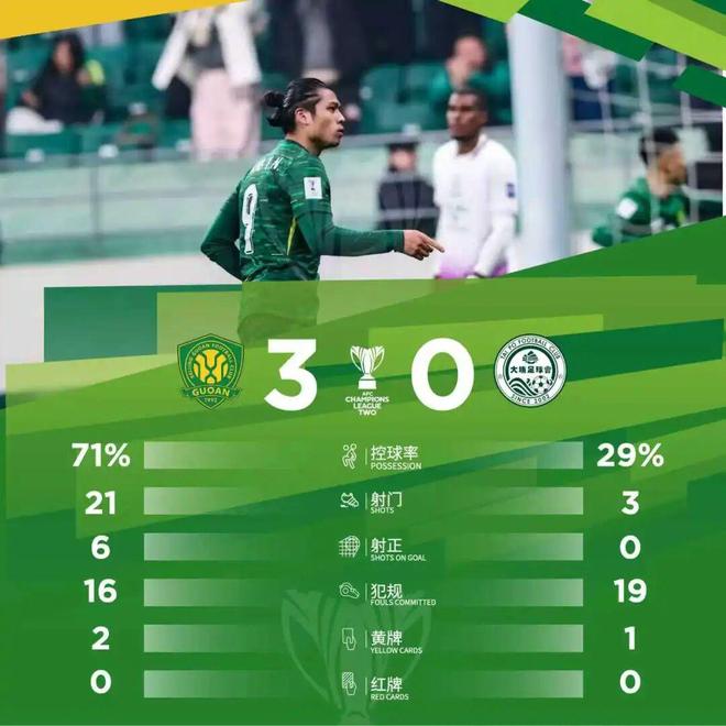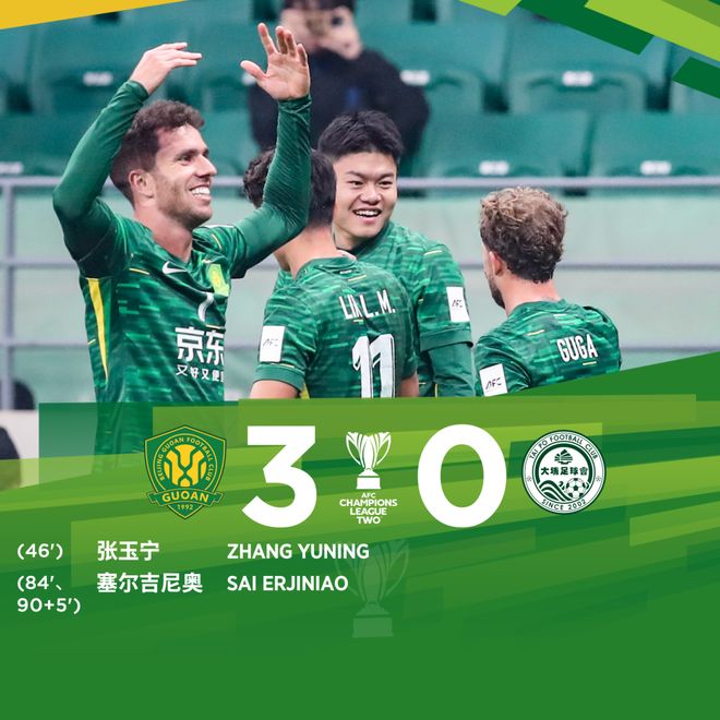 11月6日,在2025-26亚冠二级联赛小组赛第4轮中,北京国安主场3-0战胜大埔。第14分钟,法比奥回做,达万禁区前沿的射门被对方后卫挡出底线。第28分钟,王刚的远射发生折射后偏出球门。第36分钟,法比奥中路抢点被对手破坏。上半场比赛,双方战成0-0平。易边再战,北京国安迅速取得领先。第46分钟,何宇鹏左路送出低平传中,张玉宁门前冷静推射破门。第50分钟,古加主罚角球险些直接破门,随后他的跟进补射又稍稍高出横梁。第83分钟,林良铭内切射门击中横梁。第84分钟,塞尔吉尼奥头球攻门制造角球,随后的角球进攻中,他巧妙的脚后跟射门,帮助球队扩大领先优势。补时阶段,法比奥的射门稍稍高出。随后,塞尔吉尼奥突入禁区低射破门,完成梅开二度。最终,在2025-26亚冠二级联赛小组赛第4轮中,北京国安主场3-0战胜大埔。/赛后数据//感谢/感谢每一位球迷的支持,感谢大家在寒风中的呐喊助威。国安将士们会继续全力以赴,认真备战接下来的每场比赛。下一场,我们工体见!/赛事预告/即可购买北京国安官方授权商品