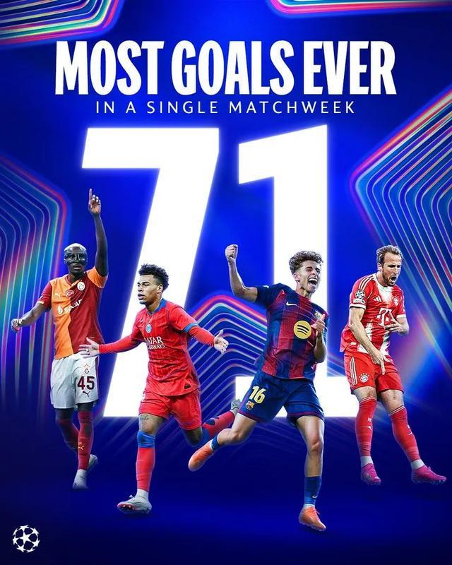 撰稿/寒冰 71球!2025/26赛季欧冠联赛阶段第3轮战罢,欧冠联赛全新单轮进球数纪录诞生。本轮18场比赛,11场至少4球,多达6场比赛至少5球。巴萨6比1奥林匹亚科斯,埃因霍温6比2那不勒斯,勒沃库森2比7大巴黎都是进球如麻的比赛,10月23日此前遭遇4连败的利物浦也在法兰克福身上找回自信,客场5比1横扫对手。这个创纪录的单轮进球数统计自欧冠19992/93赛季改制为欧冠联赛小组赛后,不包括1999/2000至2002/03赛季第二阶段小组赛。此前的纪录是2024/25赛季第5轮和2025/26赛季第1轮(67球,18场比赛),2024/25赛季第5轮多达9场比赛至少进5球,2025/26赛季第1轮只有5场比赛进球数至少5球。本赛季第1轮尤文图斯4比4多特蒙德单场打出8个进球,但被本赛季第3轮勒沃库森2比7大巴黎超越。