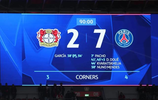 7比2客场横扫勒沃库森的大巴黎,毫无疑问是第3轮欧冠进球创纪录的旗手。这个7比2的大胜追平了大巴黎欧冠联赛队史的单场最大比分胜绩,此前是2000/01赛季小组赛第5轮主场7比2大胜挪威的罗森堡,以及2022/23赛季小组赛第5轮主场7比2海法马卡比,但同样比分的比赛含金量,显然不如这次客场横扫德甲豪门勒沃库森。值得一提的是,大巴黎此前还有两次在欧冠单场攻入7球:分别是2017/18赛季欧冠第5轮主场7比1凯尔特人,以及2024/25赛季1/8决赛主场7比0横扫布雷斯特。2024/25赛季欧冠联赛,大巴黎攻入38球已创队史纪录,而2025年大巴黎已在欧冠赛场攻入45球,成为欧冠史上单一自然年首支欧冠进球数超过40个的球队。其中仅对布雷斯特和勒沃库森两场,就贡献了14球。今年欧冠联赛阶段还有3场比赛,大巴黎先后对垒拜仁、阿森纳和毕尔巴鄂竞技,有望冲击单一自然年欧冠进球数50球大关。