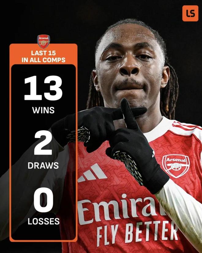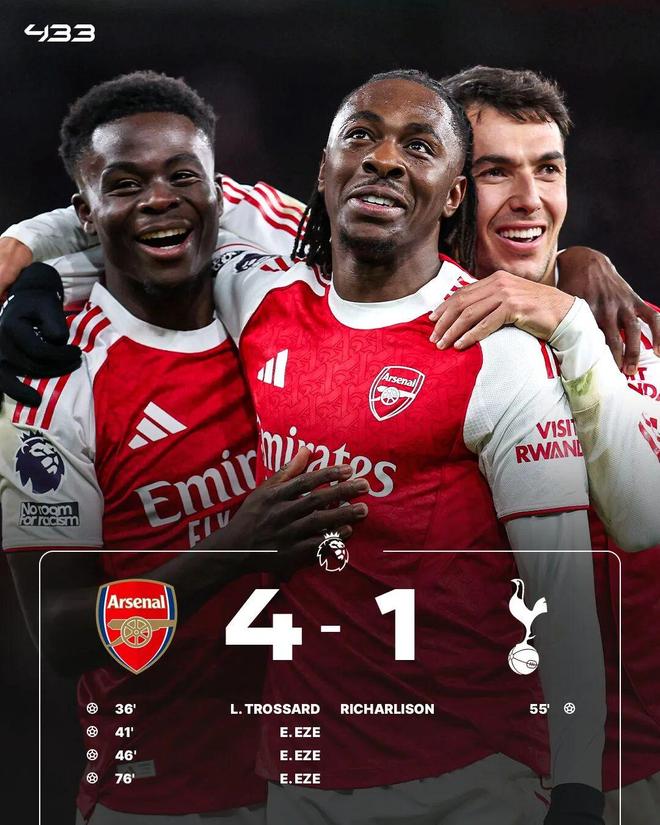 易边再战,埃泽连进2球,上演帽子戏法,热刺则是理查利松的一记超远吊射,打进扳回颜面的一球。最终,枪手主场4-1大胜热刺,各项赛事15场保持不败。