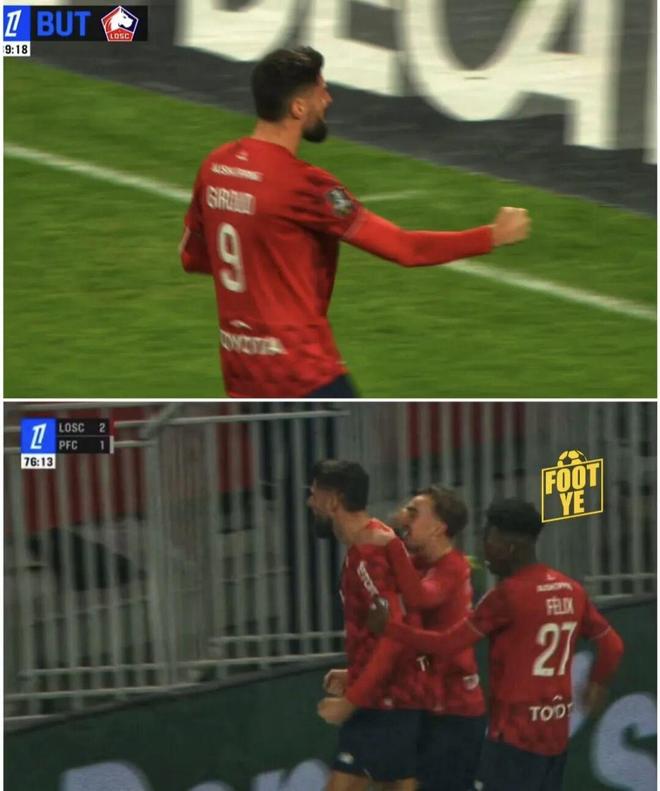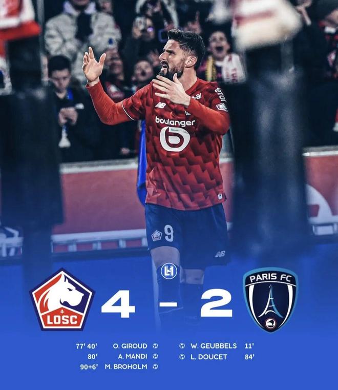 赛后据统计,现年39岁54天的吉鲁是1947-1948赛季之后,在法甲单场进2球年龄最大的球员。