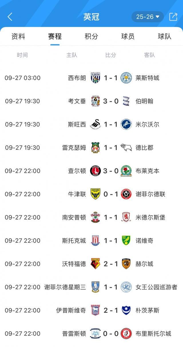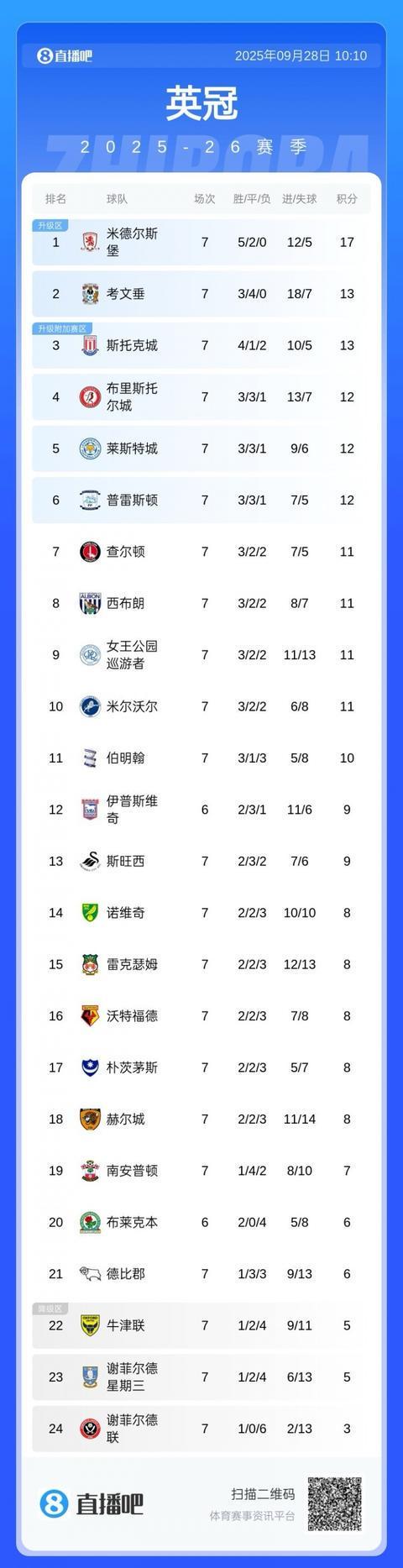 09月28日讯 英冠昨日第七轮比赛全部结束。积分榜方面,米德尔斯堡5胜2平领跑,兰帕德执教的考文垂3胜4平排在第二。莱斯特城第5,伊普斯维奇少赛1场排在第12。谢菲尔德联本轮1-0小胜牛津联,取得本赛季英冠首胜,不过仍然排在倒数第一。本轮赛果: