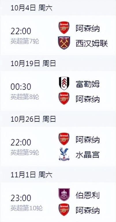 开局阶段,阿森纳接连面对对阵曼联、利物浦、纽卡斯尔、曼城等一系列硬仗。尽管如此,阿尔特塔的球队在前6轮中仍拿下13分,尤其是在老特拉福德和圣詹姆斯公园取得的客场胜利令人印象深刻。唯一遗憾的是在安菲尔德0-1告负,但整体表现已超出不少球迷的季前预期。阿森纳将先后在主场迎战西汉姆联,随后客场对阵富勒姆,之后回到主场对阵水晶宫,再连续客场挑战两支升班马伯恩利与桑德兰。