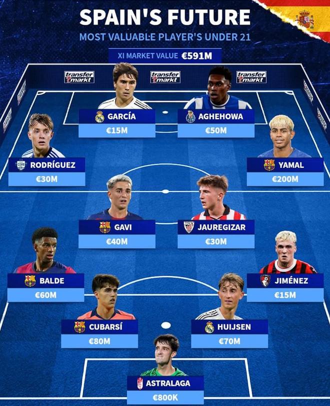 德转列西班牙最贵U21阵容:门将阿斯特拉拉加(格拉纳达)80万欧元后卫阿莱士-希门尼斯(伯恩茅斯)1500万欧元、赫伊森(皇家马德里)7000万欧元、库巴西(巴塞罗那)8000万欧元、阿莱士-巴尔德(巴塞罗那)6000万欧元中场亚马尔(巴塞罗那)2亿欧元、豪雷吉萨尔(毕尔巴鄂竞技)3000万欧元、加维(巴塞罗那)4000万欧元、赫苏斯-罗德里格斯(科莫)3000万欧元前锋奥莫罗迪翁(波尔图)5000万欧元、贡萨洛-加西亚(皇家马德里)1500万欧元总身价:5.91亿欧元【上咪咕独家看