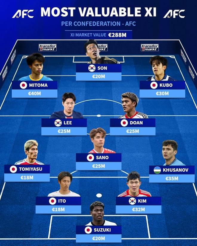 北京时间10月16日,德转列出了目前亚洲球员中身价最高的11人阵容,身价4000万欧元的三笘薰领衔,身价3500万欧元的胡桑诺夫、身价3200万欧元的金玟哉以及身价3000万欧元的久保建英在列,此外孙兴慜、李刚仁以及伊藤洋辉也都榜上有名。