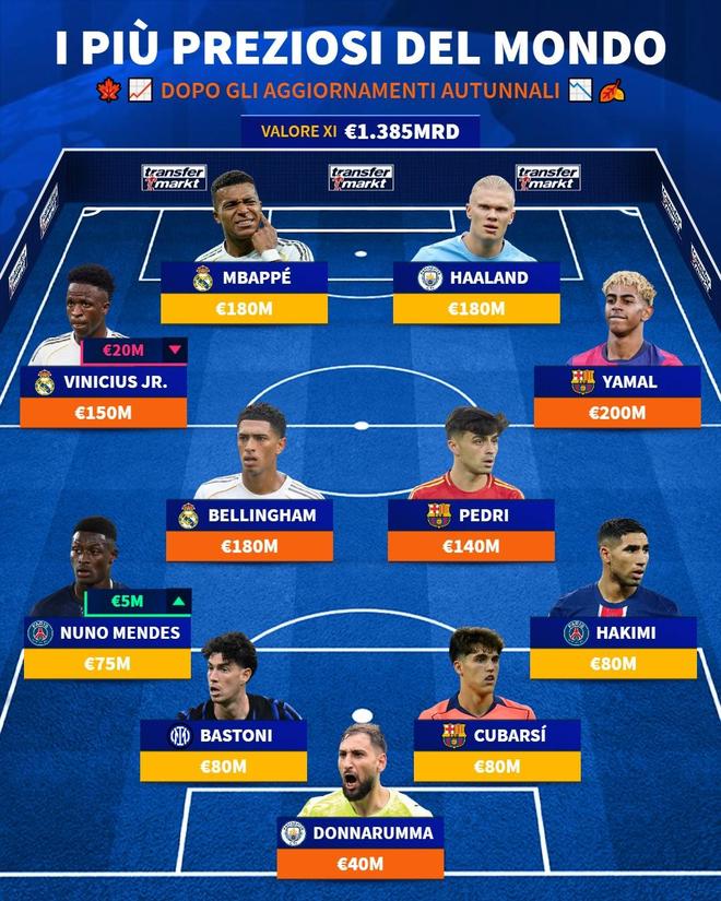 德转列世界足坛最贵11人(总身价13.85亿欧)门将:多纳鲁马(曼城,4000万欧)后卫:努诺-门德斯(巴黎,7500万欧)、巴斯托尼(国米,8000万欧)、库巴西(巴萨,8000万欧)、阿什拉夫(巴黎,8000万欧)中场:贝林厄姆(皇马,1.8亿欧)、佩德里(巴萨,1.4亿欧)前锋:维尼修斯(皇马,1.5亿欧)、姆巴佩(皇马,1.8亿欧)、哈兰德(曼城,1.8亿欧)、亚马尔(巴萨,2亿欧)【上咪咕独家看