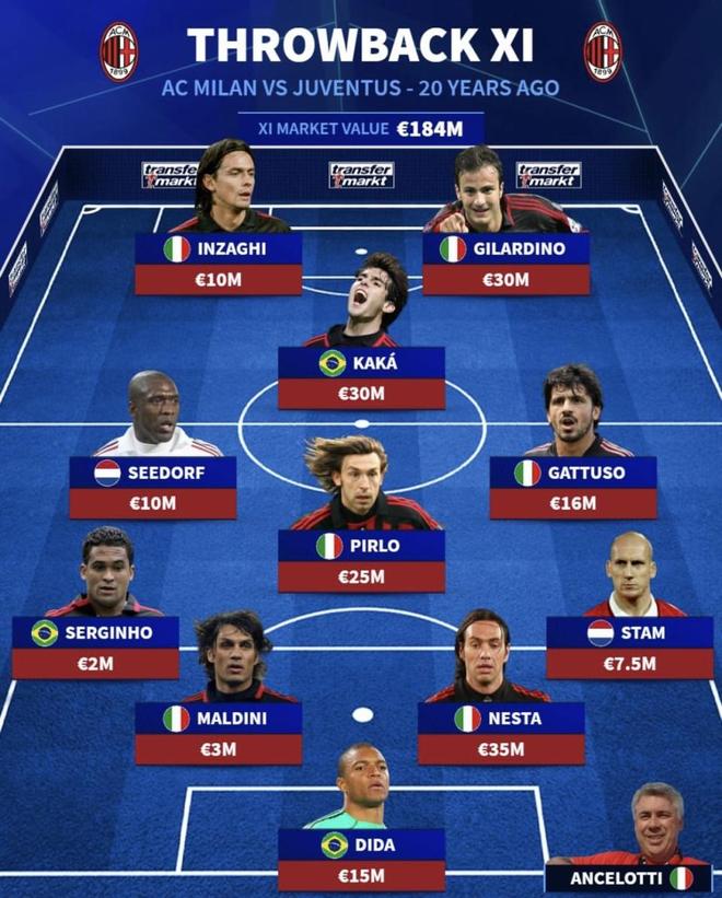 AC米兰首发 | 总身价1.84亿欧元门将迪达——1500万欧元后卫塞尔吉尼奥——200万欧元马尔蒂尼——300万欧元内斯塔——3500万欧元斯塔姆——750万欧元