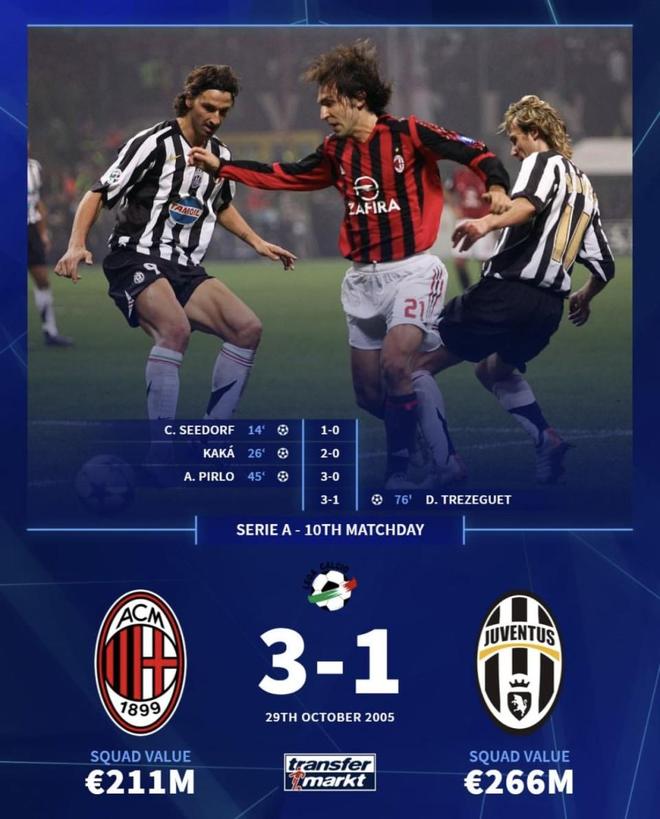 比赛信息赛事:意甲第10轮时间:2005-10-29比分:AC米兰3-1尤文图斯进球(米兰):14′西多夫;26′卡卡;45′皮尔洛进球(尤文):76′特雷泽盖米兰全队身价:2.11亿欧元尤文全队身价:2.66亿欧元