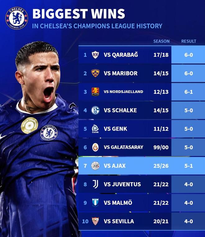 北京时间10月23日,切尔西在欧冠联赛阶段第3轮的比赛中主场5-1大胜10人作战的阿贾克斯,吉乌、莫伊塞斯-凯塞多、恩佐-费尔南德斯、埃斯特旺以及泰里克-乔治分别进球。赛后来自德转的统计指出,切尔西本场比赛首发阵容的平均年龄为21.6岁,为近15个赛季欧冠单场比赛的第8年轻首发阵容,而5-1战胜阿贾克斯则是蓝军队史在欧冠比赛的第7大比分胜利。切尔西队史欧冠单场10大分差胜利:1. vs卡拉巴赫(17-18赛季) 6-02. vs马里博尔(14-15赛季) 6-03. vs中日德兰(12-13赛季) 6-14. vs沙尔克04(14-15赛季) 5-05. vs亨克(11-12赛季) 5-06. vs加拉塔萨雷(99-00赛季) 5-07. vs阿贾克斯(25-26赛季) 5-18. vs尤文图斯(21-22赛季) 4-09. vs马尔默(21-22赛季) 4-010. vs塞维利亚(20-21赛季) 4-0【上咪咕独家看英超