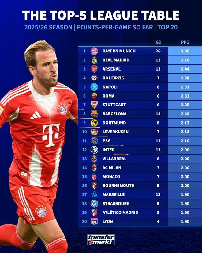 本赛季至今五大联赛场均积分前20:1. 拜仁慕尼黑 3.00分 净胜球+262. 皇家马德里 2.70分 净胜球+123. 阿森纳 2.44分 净胜球+134. RB莱比锡 2.38分 净胜球+75. 那不勒斯 2.33分 净胜球+86. 罗马 2.33分 净胜球+67. 斯图加特 2.25分 净胜球+68. 巴塞罗那 2.20分 净胜球+139. 多特蒙德 2.13分 净胜球+810. 勒沃库森 2.13分 净胜球+711. 巴黎圣日耳曼 2.10分 净胜球+1112. 国际米兰 2.00分 净胜球+1113. 比利亚雷亚尔 2.00分 净胜球+814. AC米兰 2.00分 净胜球+715. 摩纳哥 2.00分 净胜球+716. 伯恩茅斯 2.00分 净胜球+517. 马赛 1.90分 净胜球+1318. 斯特拉斯堡 1.90分 净胜球+919. 马德里竞技 1.90分 净胜球+820. 里昂 1.90分 净胜球+4【上咪咕独家看英超】