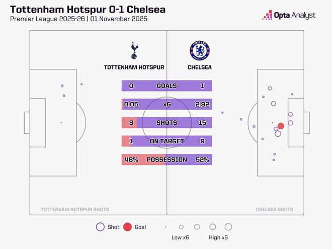 此役主场对阵切尔西,热刺全场仅完成三次射门,预期进球值(xG)仅为0.05,这是自2012-13赛季有统计以来,热刺