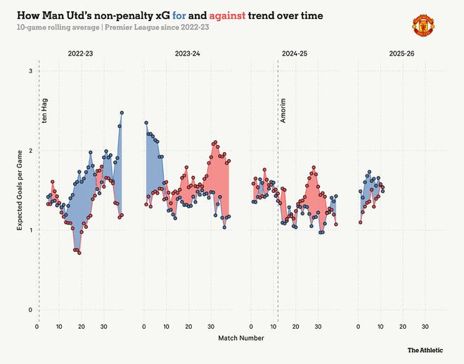 尽管格雷泽家族已将俱乐部的运营权交给拉特克利夫,但作为曼联的多数股东,他们仍参与最高层级的事务,每月的执行委员会会议是乔尔和阿夫拉姆——两位最积极参与的兄弟姐妹——获取最新信息的方式。他们较少露面的兄弟布莱恩最近在安菲尔德观看了曼联的胜利,坐在弗格森爵士和达格利什爵士附近。与此同时,兄弟姐妹中的另一位——埃德,六个月前在科戈德商学院的一次谈话中罕见地透露了他们的想法。当被问及解雇滕哈格和任命阿莫林时,他说:“这始于赢球和输球。你必须问自己,‘我们走在正确的轨道上吗?我们感觉目前的做法有效吗?’。”“这和你们作为球迷没什么不同。我常说,如果你想知道最好的球员是谁,去问球迷。他们每周都在看台上,他们知道每个球员的优点和缺点。我想象得到,有时你们会坐在那里想,‘这行不通,我们必须做出改变’。有时你做出了改变却不见效,有时你做出了改变并且确实有效。”“但你也必须有耐心;这不会一夜之间发生。无论你花了多少钱,关键在于识别人才并保持耐心。有时即使你有耐心,也仍然行不通。”“在曼彻斯特,我认为我们最近正处于翻开了新篇章的模式,现在我们必须有点耐心,给每个人机会去实现他们对于成功的愿景。未来几年将非常关键。我们希望能回到我们应该在的位置。”尽管偶尔会发表袒露心声的言论,阿莫林确实理解作为俱乐部门面所承担的责任。他制定了一条规则,要求一半的球员在比赛开始前在老特拉福德球场外为球迷签名,另一半在比赛后签名,因为之前太多球员养成了忽视球迷的习惯。事实上,现在大多数球员在进入球场时就会主动为球迷签名。阿莫林本人则在终场哨响后停留很久与球迷合影,并且在参与俱乐部事务的其他场合也展现出亲和力。他最近通过闲聊并递给一位到访卡灵顿的四岁女孩一件球衣让她在镜头前拿着,缓解了她的紧张情绪。将拉什福德、加纳乔、安东尼、桑乔和马拉西亚五名球员列为“炸弹小队”(意指清洗名单)是一个无情的举动,但在转会窗口关闭后,他确实就唯一留队的马拉西亚征求了意见。球员们对马拉西亚重返一线队训练表示了支持,阿莫林听取了这些反馈,这位荷兰后卫甚至在对阵布莱顿的比赛中进入了替补名单。曼联的伤病记录有了很大改善,虽然阿莫林也承认这可以归因于每周一赛的节奏,但他拒绝选择有风险的球员也是一个因素。尽管阿莫林最初不愿在赛季中期接手曼联,但他在那段时间里了解了关于俱乐部和他的球队的宝贵细节。曼联的总体方向是向上的,如下面这张详细显示球队随时间推移的预期进球和预期失球数据图所示。要达到滕哈赫执教第一个赛季任期的高点仍有工作要做,但在长期处于导致换帅的红色负值区域之后,代表正向差异的蓝色区域已变得更加明显。