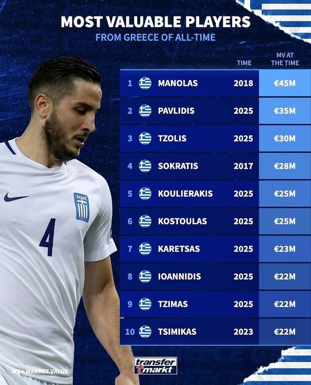 德转列希腊球员历史身价前10:1. 马诺拉斯(2018年) 4500万欧元2. 帕夫利季斯(2025年) 3500万欧元3. 措利斯(2025年) 3000万欧元4. 帕帕斯塔索普洛(2017年) 2800万欧元5. 库列拉基斯(2025年) 2500万欧元6. 科斯图拉斯(2025年) 2500万欧元7. 卡雷察斯(2025年) 2300万欧元8. 约安尼季斯(2025年) 2200万欧元9. 齐马斯(2025年) 2200万欧元10. 齐米卡斯(2023年) 2200万欧元【上咪咕独家看英超】