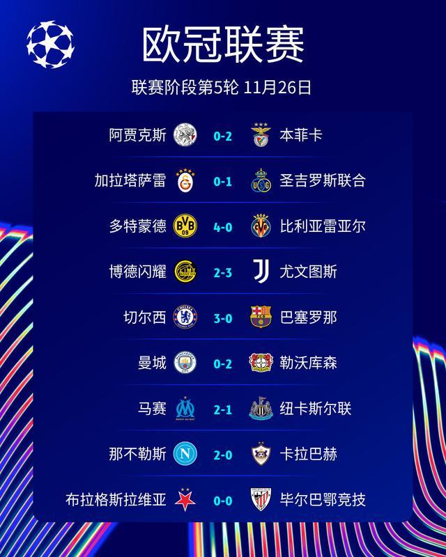 巴萨因这场失利而暂失小组头名主动权,防线漏洞与多线作战的体能问题亟待解决。在斯坦福桥的夜空下,蓝军则成功取得了一场酣畅淋漓的胜利!至此,本赛季欧冠联赛阶段第5轮首日9场比赛战罢,结果分别为:阿贾克斯0-2本菲卡、加拉塔萨雷0-1圣吉罗斯联合、多特蒙德4-0比利亚雷亚尔、博德闪耀2-3尤文图斯、切尔西3-0巴塞罗那、曼城0-2勒沃库森、马赛2-1纽卡斯尔联、那不勒斯2-0卡拉巴赫、布拉格斯拉维亚0-0毕尔巴鄂竞技。对于切尔西3-0巴塞罗那这场比赛,球迷有何看法呢?