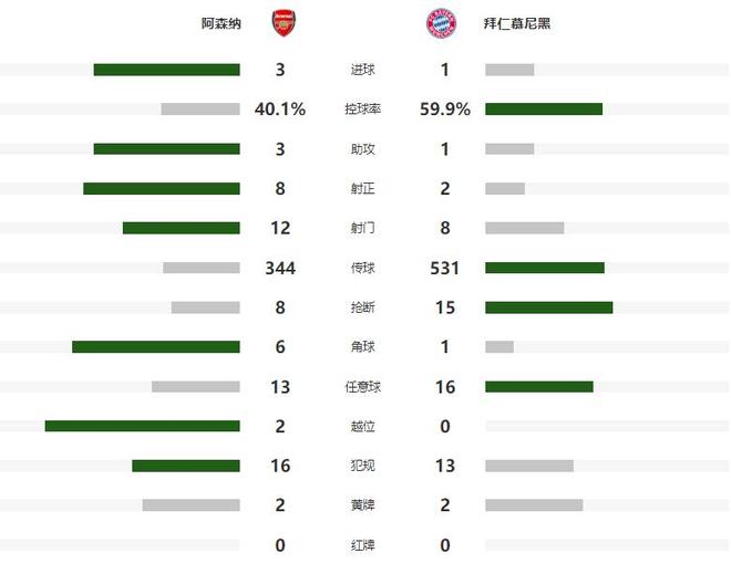 在本月的国际比赛日开打前,南大王拜仁慕尼黑在德甲第十轮客场被柏林联合逼平,停下了开局16连胜的脚步,但他们依旧是本赛季五大联赛表现最出色的球队,上一轮主场大胜弗赖堡后,南大王在本赛季前18场比赛豪取17胜1平的不败战绩。这一个比赛日,拜仁在欧冠联赛第五轮,迎来了一场硬仗,奔赴酋长球场挑战英超领头羊阿森纳,本场比赛阿森纳攻防两端表现更胜一筹,靠着廷伯、马杜埃凯和马丁内利的进球,在主场3-1击败了拜仁,在欧冠和英超双线领跑。如今的阿森纳拥有欧洲足坛最稳固的后防,不仅英超丢球数最少,而且欧冠前四轮全部以零封的方式获胜,此役面对来势汹汹的南大王,阿尔特塔在主场也是尽遣主力出战,在433的体系中,让拉亚镇守龙门,斯凯利、莫斯克拉、萨利巴和廷伯组成后防,赖斯、苏维门迪和埃泽坐镇中场,进攻三叉戟则是特罗萨德、梅里诺和萨卡。两支球队上赛季欧冠交过手,当时拜仁1胜1平保持不败,为了延续面对阿森纳的强势发挥,孔帕尼此战也没有丝毫保留,在4231的阵型中,首发门将诺伊尔,斯坦尼西奇、若纳坦塔、于帕梅卡诺和莱默尔构筑防线,基米希和帕夫洛维奇搭档双后腰,奥利塞、卡尔和格纳布里在中场一字排开,单箭头则是哈里凯恩。主场作战的阿森纳,在比赛大幕拉开后,就连续给拜仁后防施压,并且在第22分钟用自己的杀手锏定位球打破了场上的平衡,右侧角球开出后,廷伯高高跃起头球破门,帮助枪手在主场取得了1-0的领先,这也是拜仁慕尼黑在本届欧冠首次陷入比分落后的处境之中。第33分钟拜仁后场长传找到了前场的格纳布里,后者右路横敲门前,中路包抄的小将卡尔破门得分,将比分追至1平,半场比赛结束之前,萨利巴禁区内解围打在队友身上,差点给了凯恩一个单刀机会,好在拉亚反应够快,第一时间将球抱在怀中。下半场比赛开打之后,阿森纳连续利用定位球的机会,制造出了有威胁的进攻,让拜仁的门前风声鹤唳,第62分钟赖斯左路杀入拜仁禁区,调整一步后抽射远角,被诺伊尔伸腿挡出,错失再次领先的绝佳机会。狂攻不止的阿森纳,在第70分钟再次取得领先,前场抢断后瞬间形成反击,卡拉菲奥里左路下底传中,马杜埃凯后点包抄破门得分,打进了加盟阿森纳后的首粒进球,帮助枪手将比分反超为2-1,第77分钟阿森纳彻底终结了胜负的悬念,诺伊尔出击失误,被马丁内利直接过掉,后者随后打空门,将比分定格为了3-1。【本场数据】这一场失利是拜仁本赛季的首场败仗,足以证明阿森纳的战斗力多么强,不过南大王仍然在欧冠积分榜上名列前茅,掌握着直接晋级第二阶段淘汰赛的主动权。