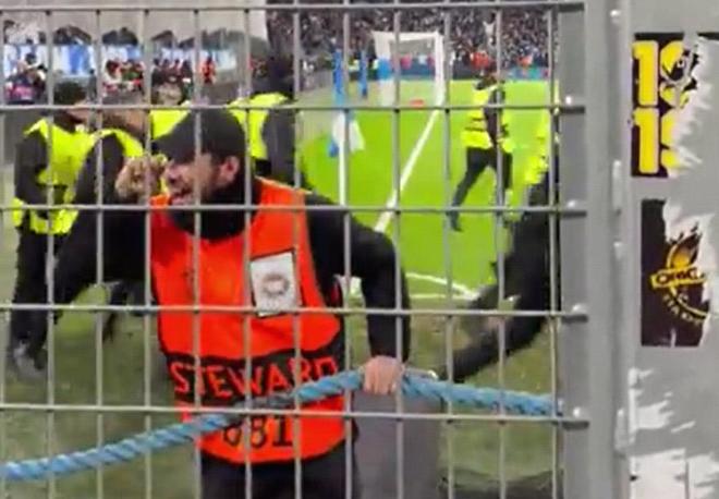 纽卡欧冠客战输马赛,球场一保安对着客场球迷庆祝+做哭脸