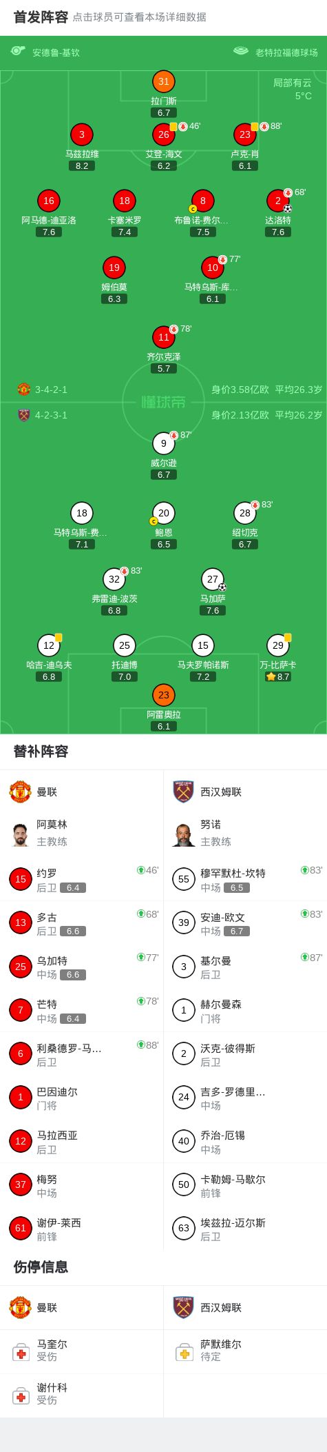 北京时间12月5日,英格兰足球超级联赛第14轮,曼联坐镇主场迎战西汉姆联。上半场,姆伯莫兜射被阿雷奥拉飞身救险,齐尔克泽撞射被万-比萨卡门线解围,B费凌空二踢脚中柱;下半场,卡塞米罗打门被挡后达洛特补射入网,鲍恩头球被解围后马加萨补射扳平。最终,双方以1比1握手言和。关键事件第58分钟,卡塞米罗打门被挡,达洛特得球补射入网!曼联1-0西汉姆联