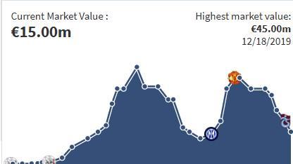 奥纳纳的身价巅峰出现在2019年12月18日,当时他效力于阿贾克斯,身价来到了4500万欧。从国米加盟曼联后,他的身价又迎来了第二次高峰,达到了4000万欧元,不过自那以后,奥纳纳的身价就一路下滑,目前已经来到了1500万欧。本赛季租借加盟特拉布宗体育后,奥纳纳坐稳了球队首发,一共为球队出场12次,甚至还有1次助攻的数据。【上咪咕独家看