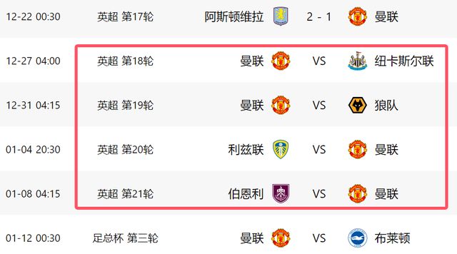 这个周末,曼联将在主场迎战纽卡斯尔,后者上赛季位居前五,拿到一个欧冠席位。不过也因为欧冠的影响,纽卡斯尔本赛季在英超表现明显下滑。特别是客场,纽卡斯尔赛季至今8战仅1胜。如果曼联正常发挥,有很大机会战胜对手,拿到3分。除了纽卡斯尔之外,曼联另外3个对手都是保级队,他们分别是狼队、利兹联和伯恩利。由于表现低迷,狼队本赛季已经基本预定了一个降级名额,在自己的主场,曼联如果拿不到胜利,无疑将是一大耻辱。虽然后面2场比赛都是做客,但是利兹联和伯恩利的实力不强,曼联要是能做好防守,也有机会都拿到3分。