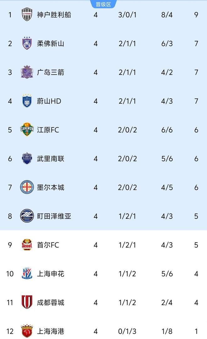 4轮过后的积分榜,由于本轮惨淡的战绩,3支中超球队不仅全都无缘前8,而且包揽了倒数3名的位置。申花和成都蓉城同积4分,申花凭借着净胜球的优势排在倒数第3,成都蓉城位列倒数第2,唯一没有取胜的上海海港积1分垫底。榜首方面,神户胜利船成为唯一一支4轮3胜的球队,以9分领跑积分榜,广岛三箭、蔚山HD同积7分分列第2和第3。本轮之后,晋级区积分线提升到5分,申花和成都蓉城都仅有1分之差,目前晋级希望还算比较大一些。两队最后4轮比赛的对手一样,3支J联赛球队以及武里南联,唯一实力相对较弱的武里南联还是客场作战,这样的赛程可谓非常艰难。仅有1分的上港目前落后晋级区已经有4分,由于仅剩下4轮比赛,他们想要晋级几乎已经没有容错空间。最后4场比赛,上港要先后挑战3支K联赛球队以及今天击败申花的柔佛新山,其中与柔佛新山的比赛同样客场作战。从赛程来看,最坏的情况3支中超球队恐怕都会无缘晋级。