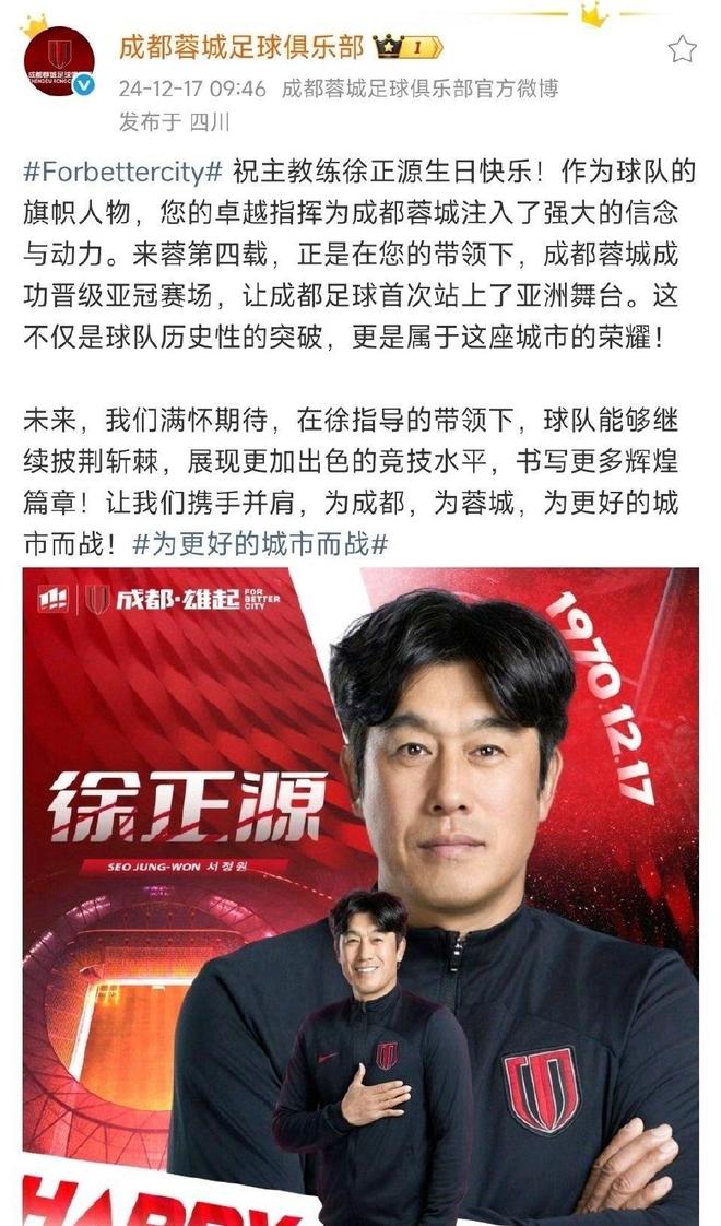 而在去年的12月17日,成都蓉城官方账号在当天上午9点多,就早早发文祝徐正源生日快乐,然而今年截止到17日晚上10点多,蓉城社媒仍静悄悄、没有发文。而前几天,蓉城官媒还为助教送上了生日祝福。这一反常举动,被外界认为与双方续约谈崩有关。